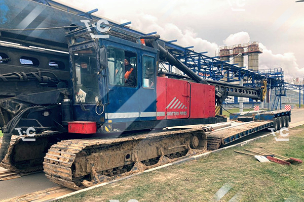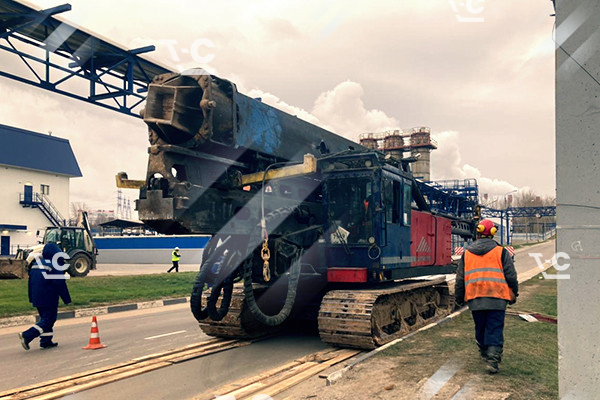 Перевозка буровой установки Junttan на трале по территории завода